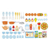 Multiple kitchen accessories (pots, pans, utensils, food pieces)